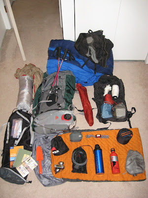 One person tent, 20 degree down sleeping bag, waterproof stuff sack, thermarest sleeping pad, 1st aid kit, gaiters, field repair kit, headlamp, trekking poles, stove and fuel bottle, gaiters, leatherman, water filter, hydration system, water bottle, pot, spoon, zip lock bags, parachute cord, pack towel, 85 liter pack, stowable daypack, guidebook, notebook, pen, novel (I haven't decided which one yet), 1GB MP3 player, camera, toiletries, pack cover, rock shoes (not pictured) and a chalk bag (not pictured).